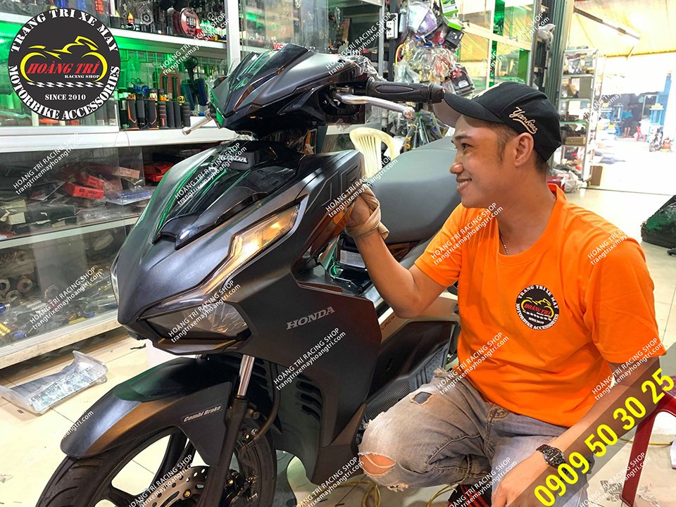 Thợ dán tem xe Cửa hàng phụ kiện xe máy Hoàng Trí đang dán keo xe Honda AB 2020