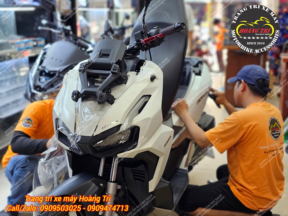 Chiếc ADV 160 màu trắng đang được anh em kỹ thuật dán keo trong nhám